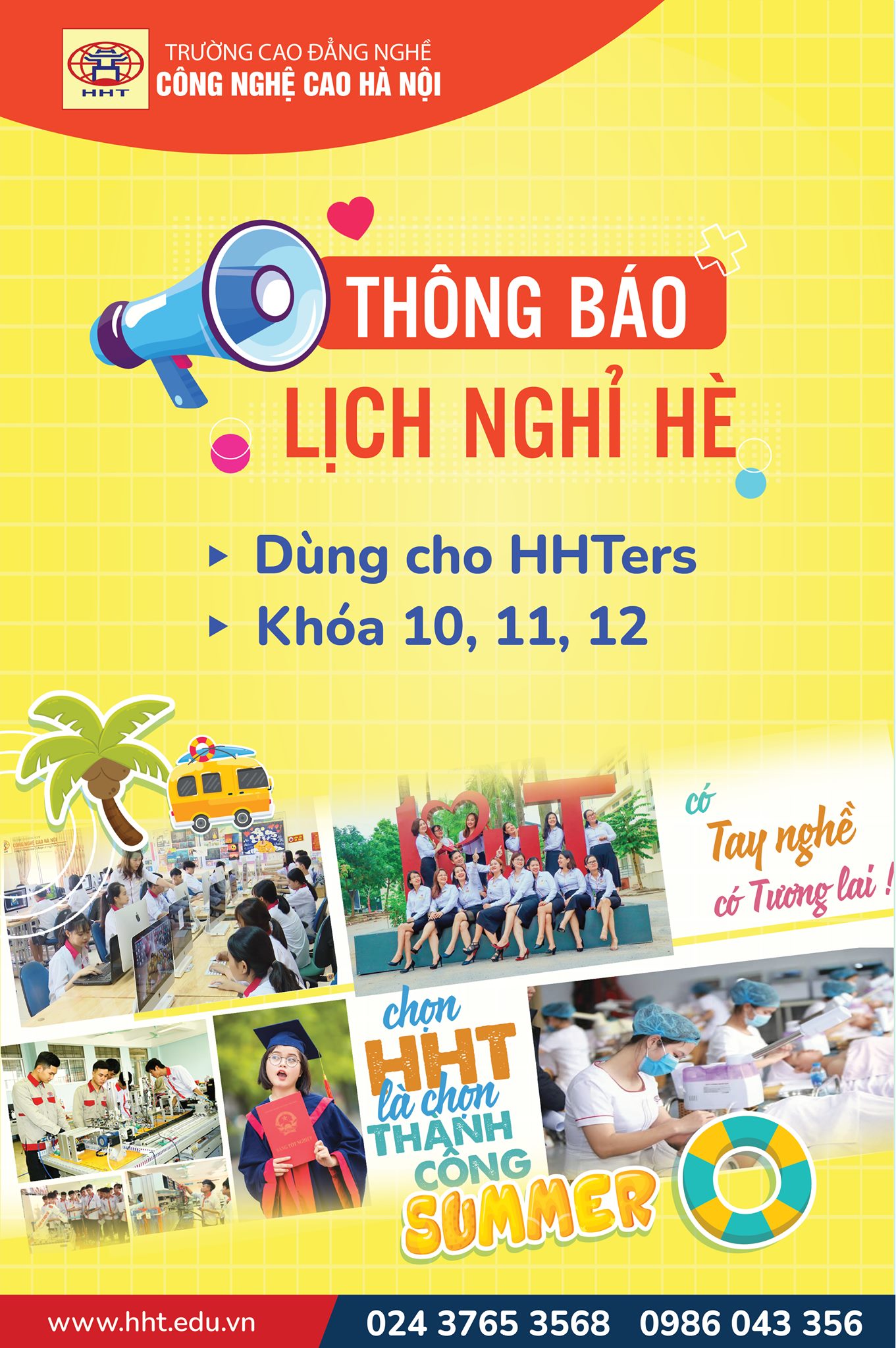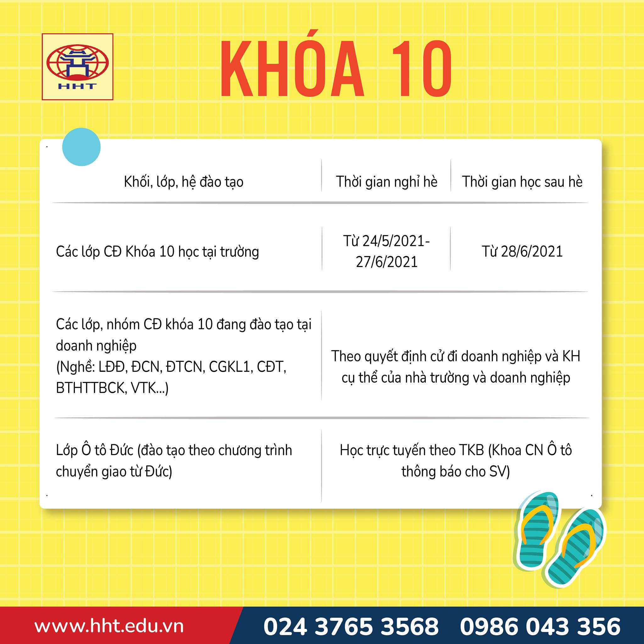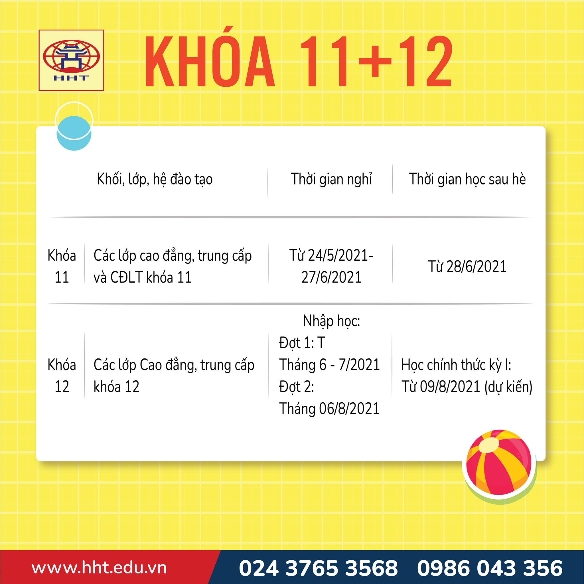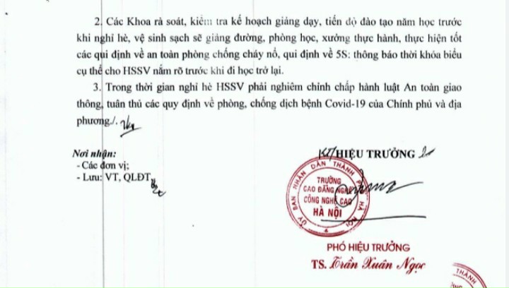 Ngày 20/5/2021, Trường Cao đẳng nghề Công nghệ cao Hà Nội ban hành Thông báo số 424/TB – CĐNCNC thông báo về việc nghỉ hè đối với HSSV năm học 2020 – 2021 kèm theo Thông báo số 425 Thông báo rà soát kế hoạch đào tạo khóa 10, 11 và xây dựng KH, tiến độ đào tạo